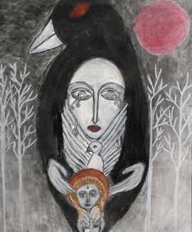Die von ihr angewandte Technik ist Kohle, Gouache, Aquarell und Acryl auf ökologischem Papier.