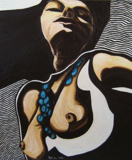 Olena Bratiychuk Linse lives in Switzerland, but comes from Ukraine. Her imposing paintings represent and symbolize female self-confidence and assurance. She admits they are affected by a Southern European ideal of beauty and make reference to classical and ancient Greek models. The artist explains her creative process as such, “I do not work with models, but I can see the faces, hear stories of friends and acquaintances and use them in my portraits. A symbiosis often occurs from what I hear, from my own life experiences, my feelings and my imagination. My paintings find their final shape first in my mind”.