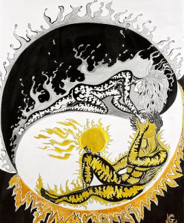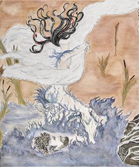 由此,她画中的每个线条、每个曲面和每个颜色都是追求和谐自然平衡的一部分。画家对历史和自然的热情是她创作灵感的主要来源。她希望可以通过自己寓言性的图像语言来强调人与自然之间重要的联系。